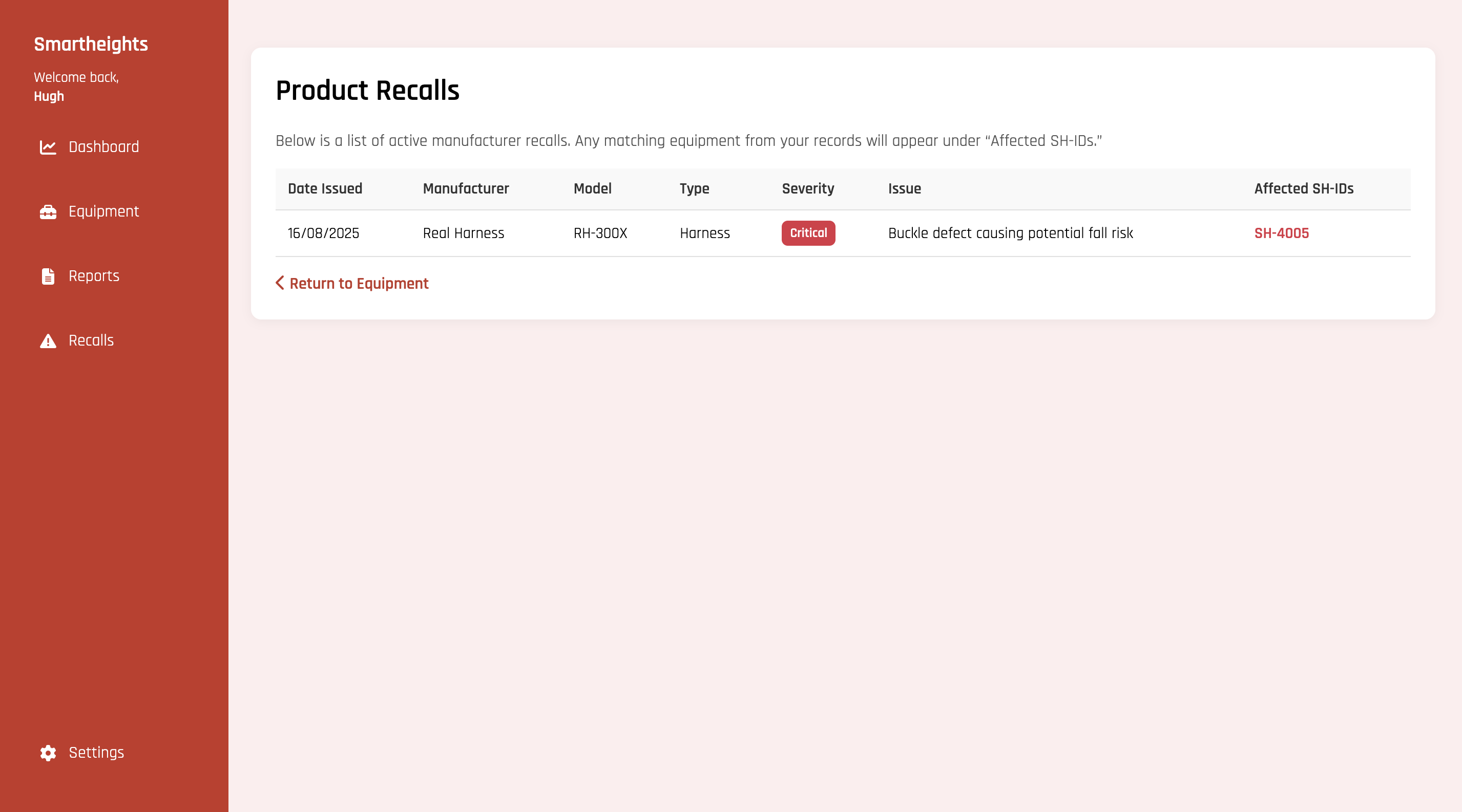 With partnering manufacturers, Smartheights instantly flags recalled equipment that affect your inventory. Get notified before risks escalate, and act fast to remove risks and keep your team safe.